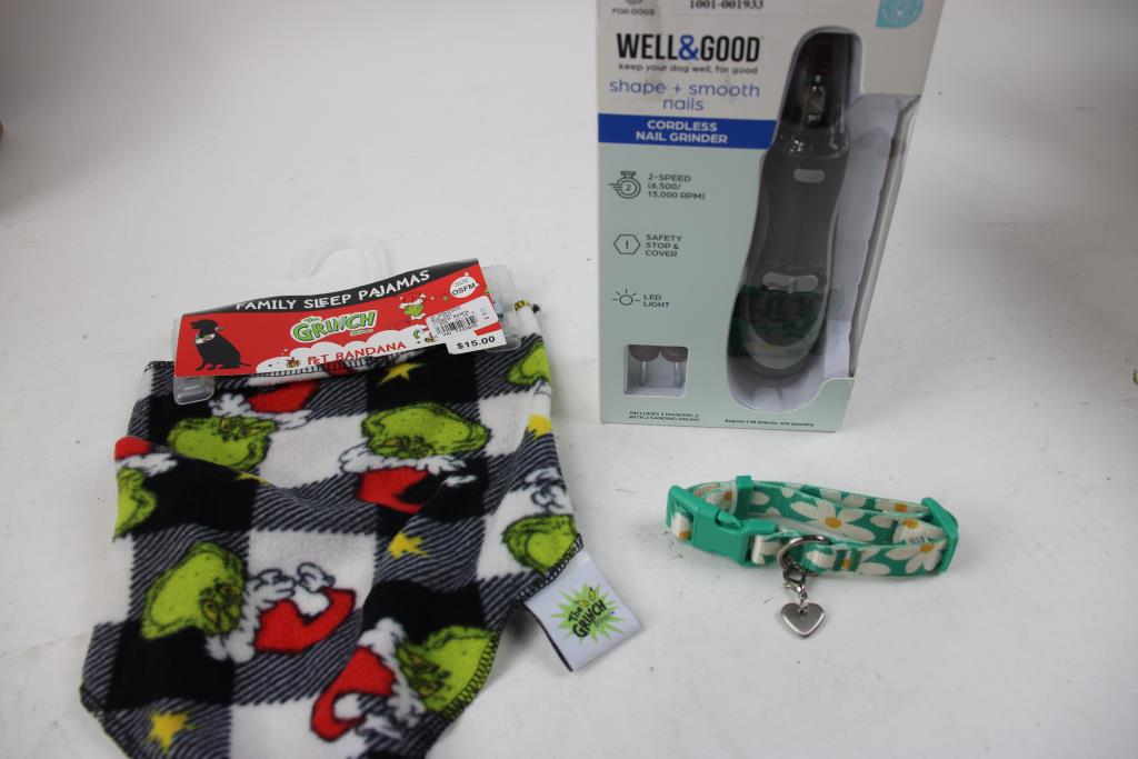 Grinch Pet Bandana, Cordless Dog Nail Grinder, Pink Dog Harness And More, 5 Pieces