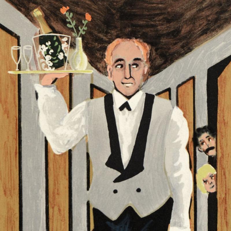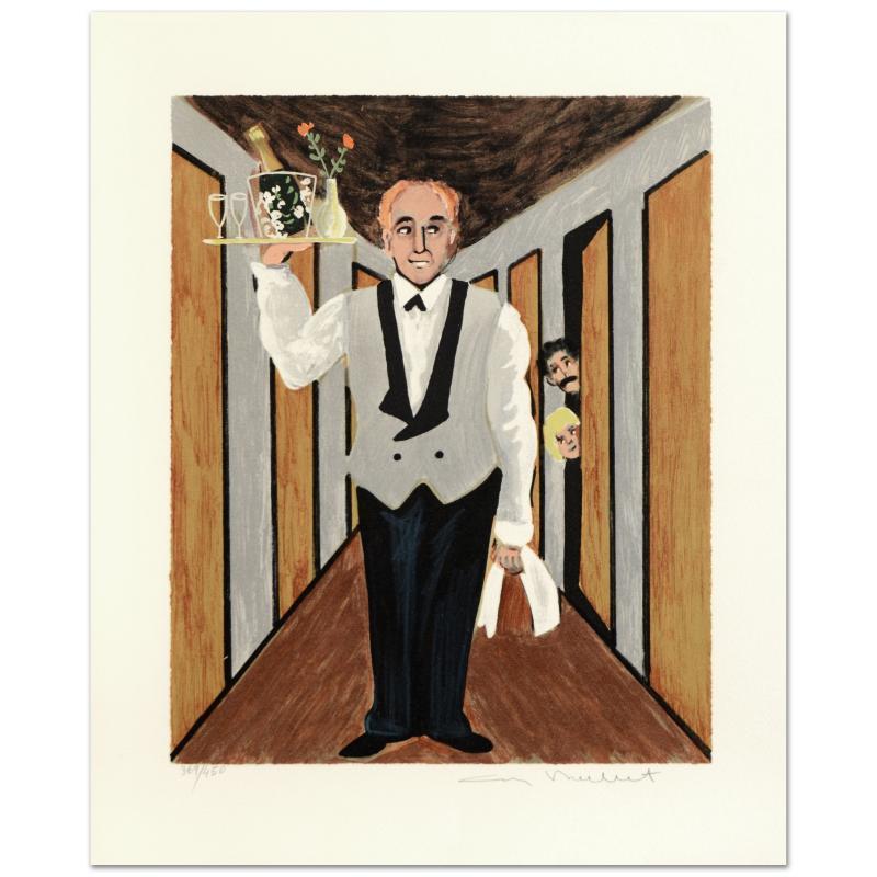 "Room Service" is a limited edition lithograph on paper by Guy Buffet, numbered and hand signed by the artist! Measures approx. 15" x 19" (with border); 12" x 15" (image).