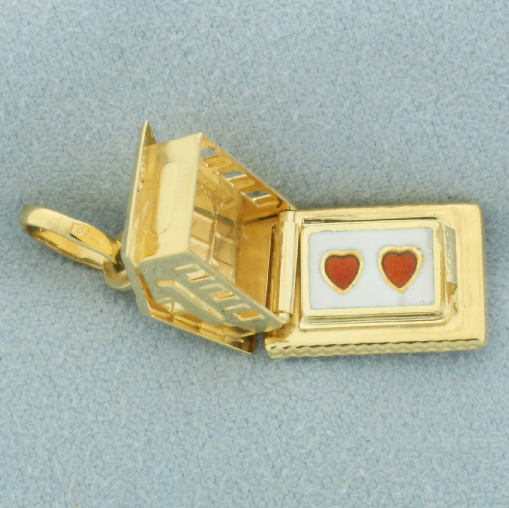 In 18k yellow gold. Home opens up to show two hearts. 1/2 inches long and 3/8 inches wide closed, 1 inch long opened. 2.8g.