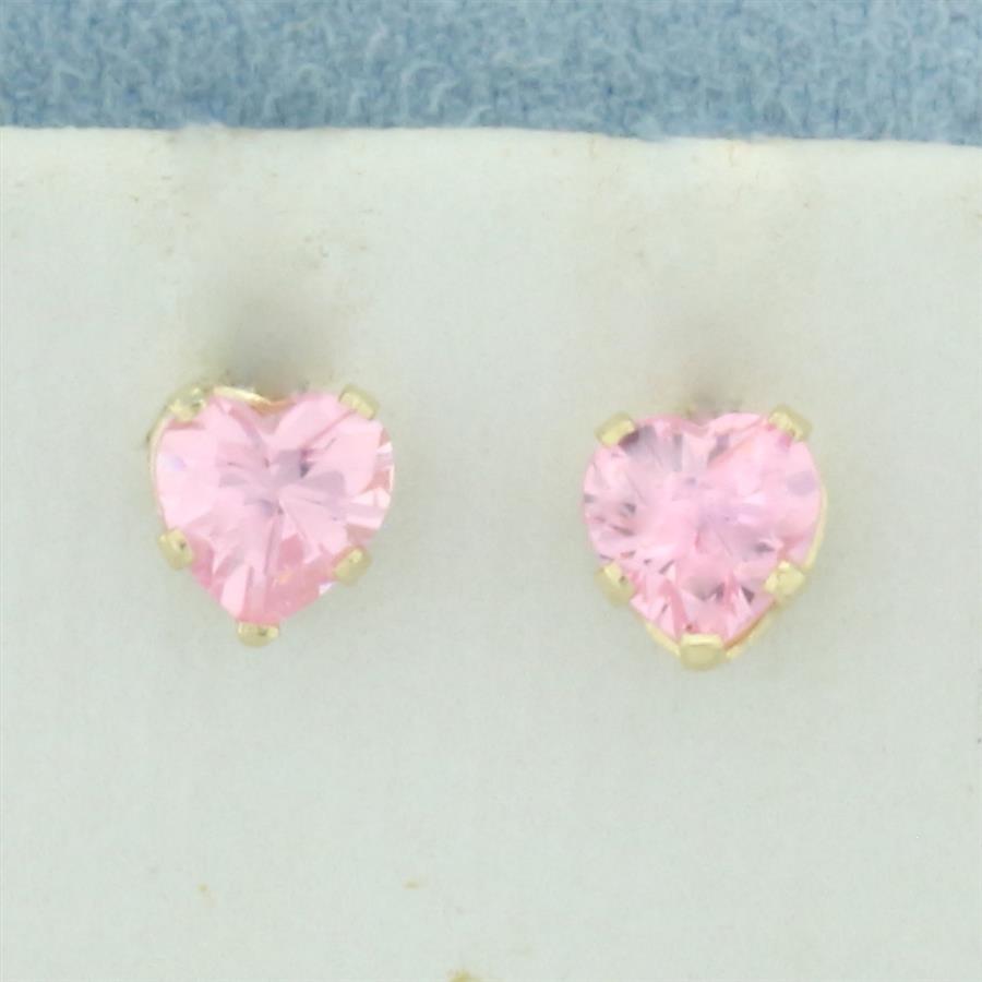 In 14k yellow gold. Contains two high quality natural 5mm heart shaped Morganite gemstones with bright color and excellent clarity. Friction backs. .8g.