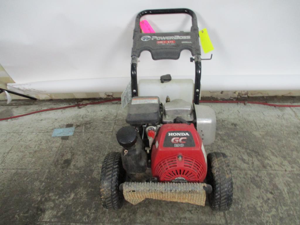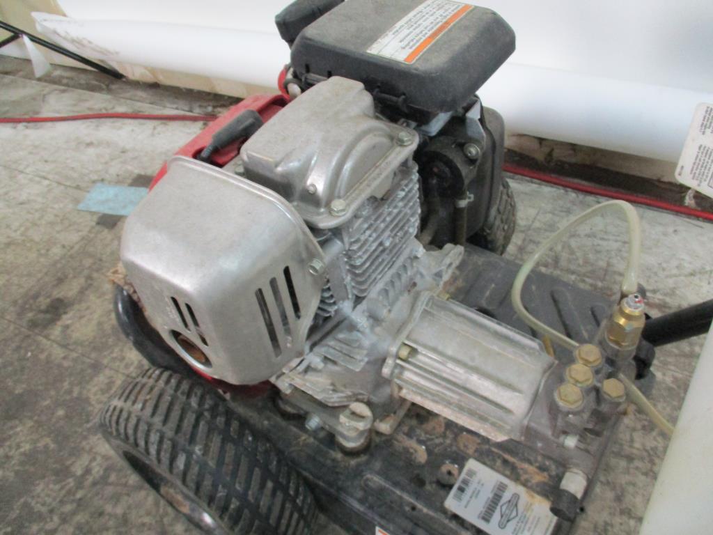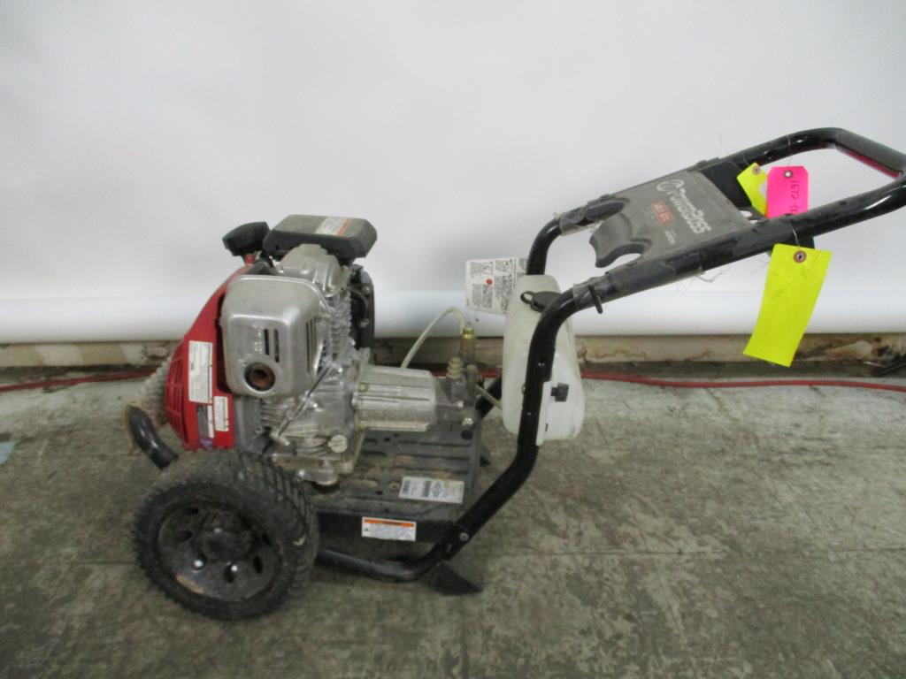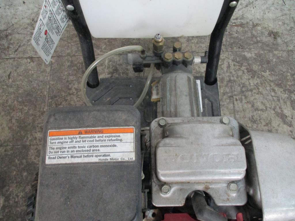 - gas powered, pull cord start, Honda engine GC190, 3100 psi, 2.7 gpm, soap dispensor, handle w/ dual wheels for easy mobility.
