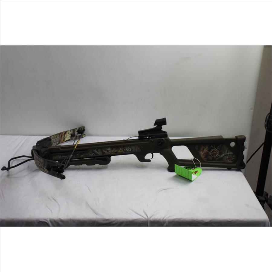 Get a great deal with this online auction presented by PropertyRoom.com on behalf of a law enforcement or public agency client. Model: Summit 150 - W49816 Color: Camo Bow Length: 25" Draw Length: 14" Draw Weight: 150lbs Draw: Crossbow Accessories: None Cosmetic Condition: Fair Shipment by PropertyRoom to any jurisdiction does not mean this item is legal in such jurisdiction. It is your responsibility to have knowledge of, obey, or comply with all applicable laws relating to this item.