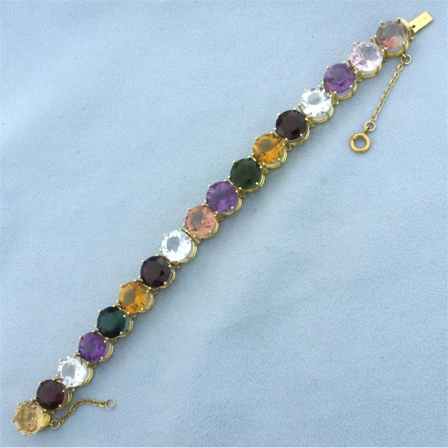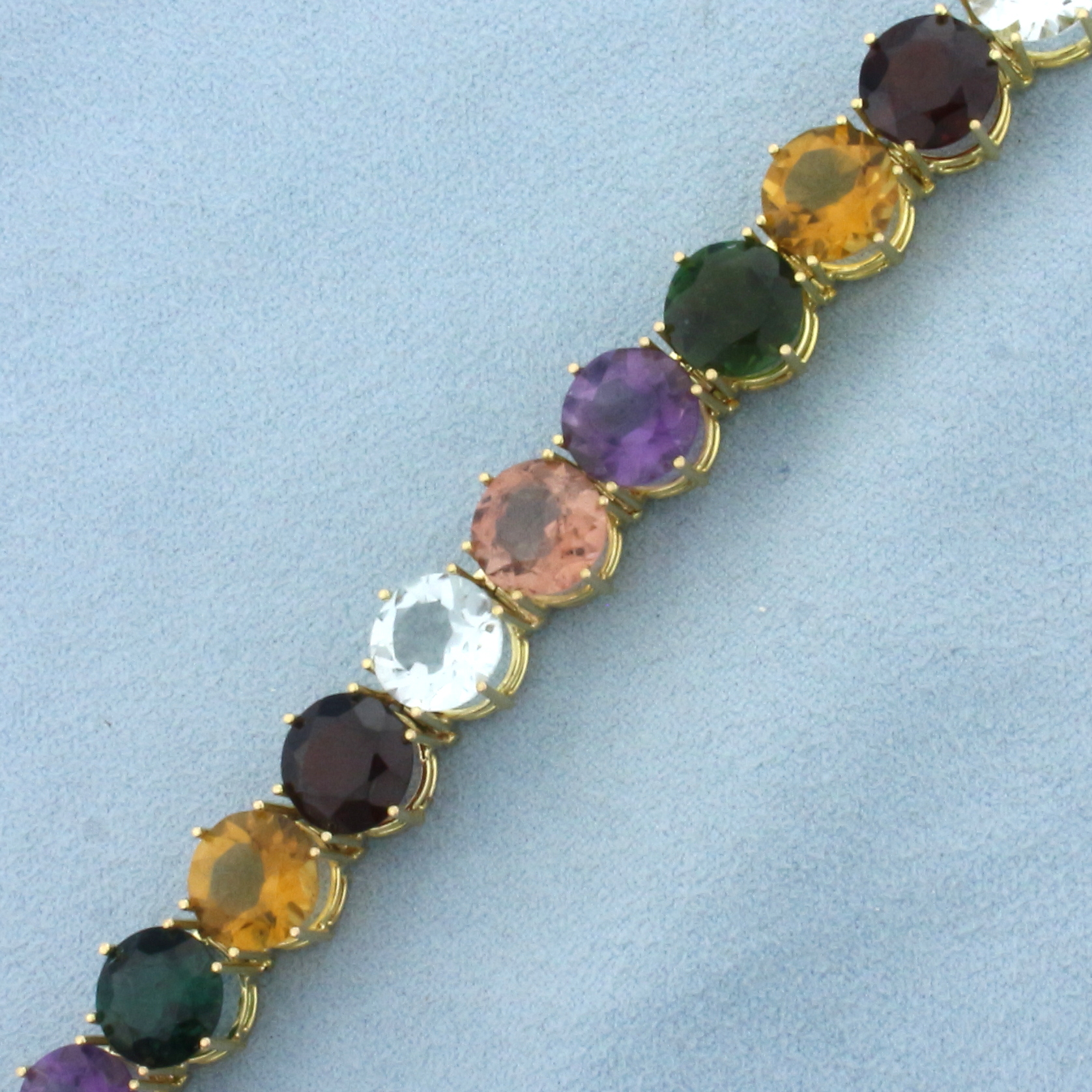 In 18k Yellow Gold. Contains 10mm high quality natural gemstones including citrine, garnet, white topaz, amethyst, aquamarine, green garnet, quartz, and morganite, all with intense color and excellent clarity. 7 inches long. 1/2 inch wide at widest point. Slide clasp with safety chain. 28.9g.