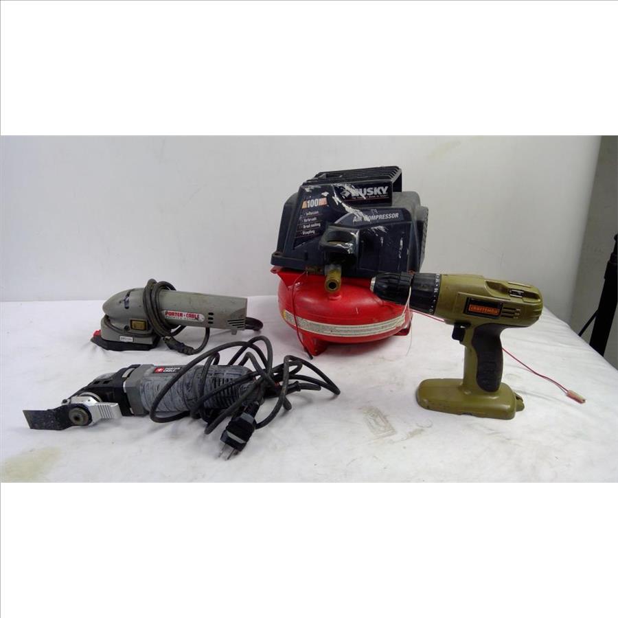 Get a great deal with this online auction presented by PropertyRoom.com on behalf of a law enforcement or public agency client. - Model: Husky Air Compressor, Stanley Drill, Porter Cable Corded tools