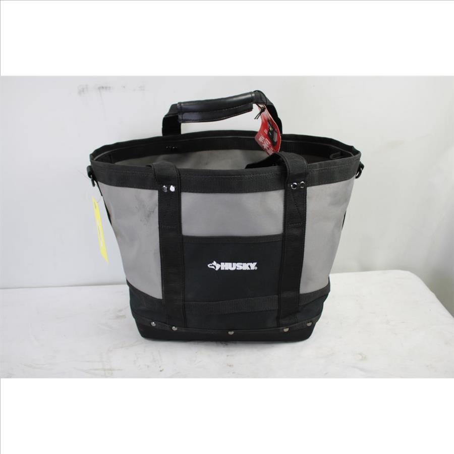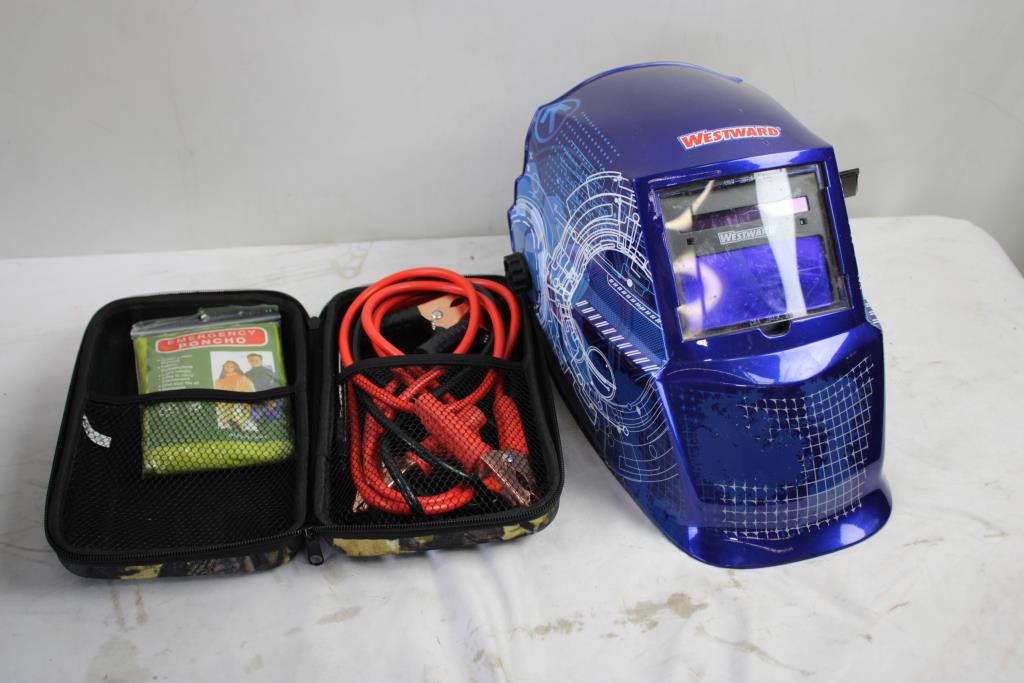Husky Tool Bag, Welding Helmet, Car Jumper Cables, Green Ratchet Tie Down