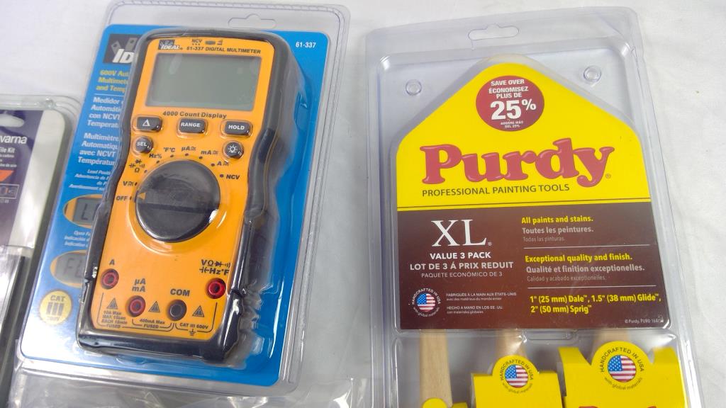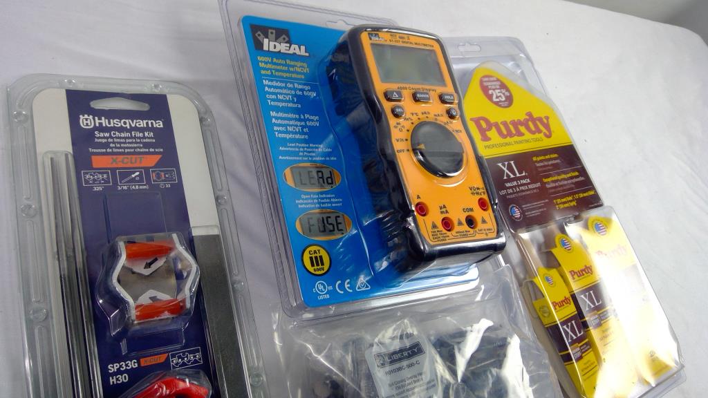 Husqvarna Saw Chain File Kit, IDEAL Multimeter, Purdy Painting Tools, And Hinges