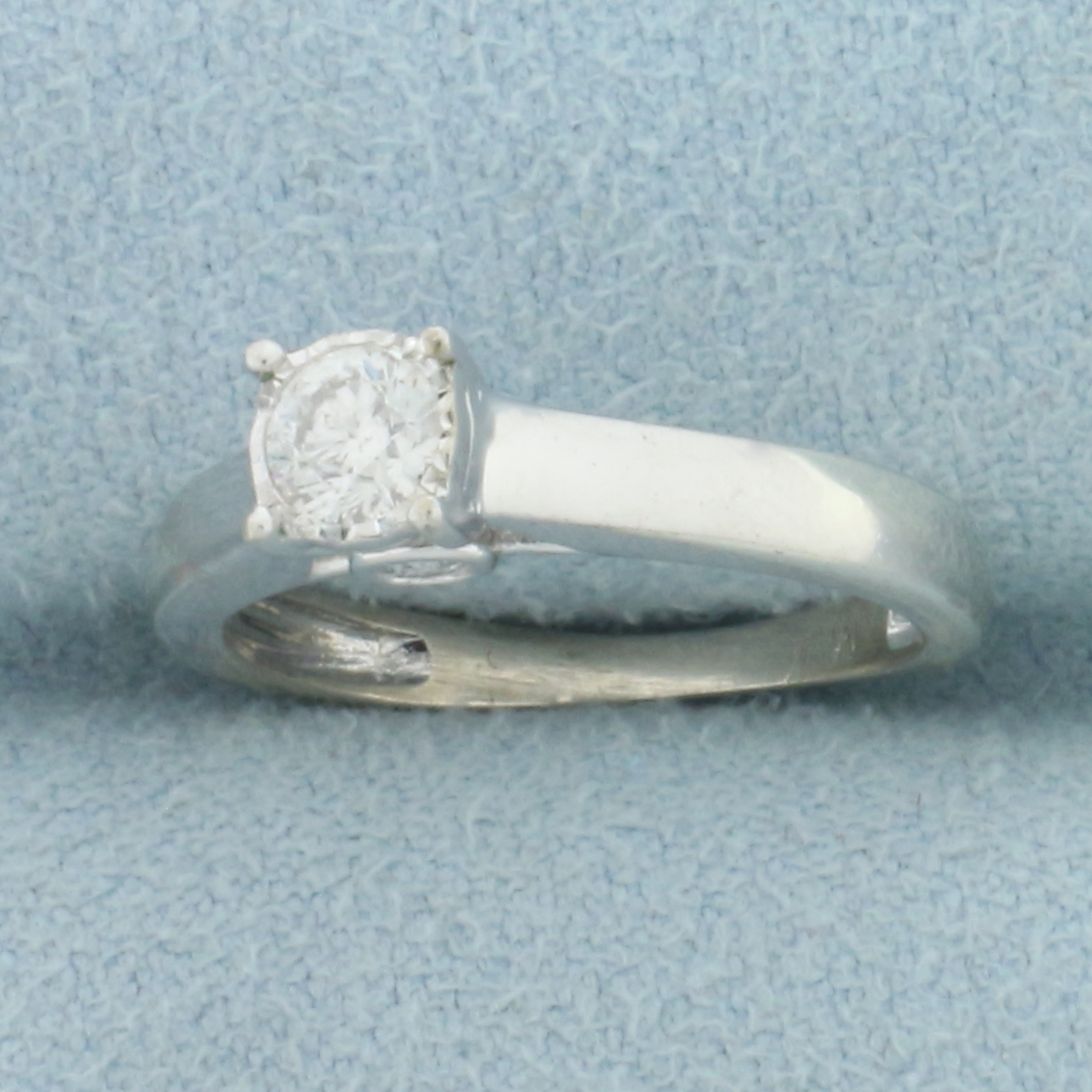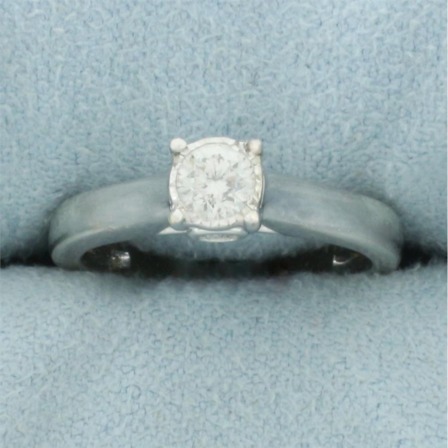 In Sterling Silver. Contains one high quality 1/4ct round brilliant diamonds, SI2 clarity/H color, eye clean, great cut for lots of sparkle. Mounting gives the appearance of a 1/3ct diamond by fashioning white gold in an illusion head. Also contains two .05ct diamonds in shank of similar high quality. Size: 4.