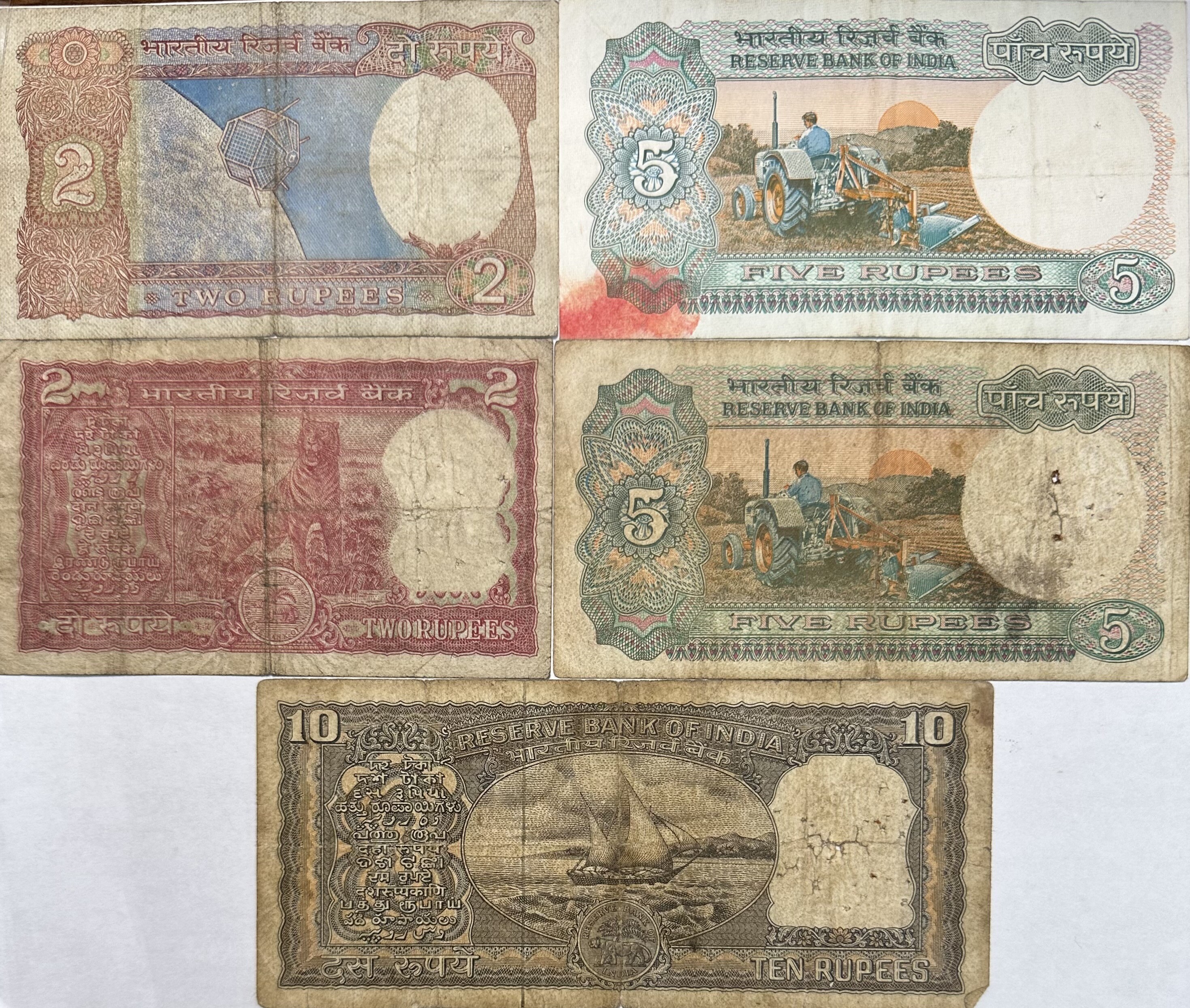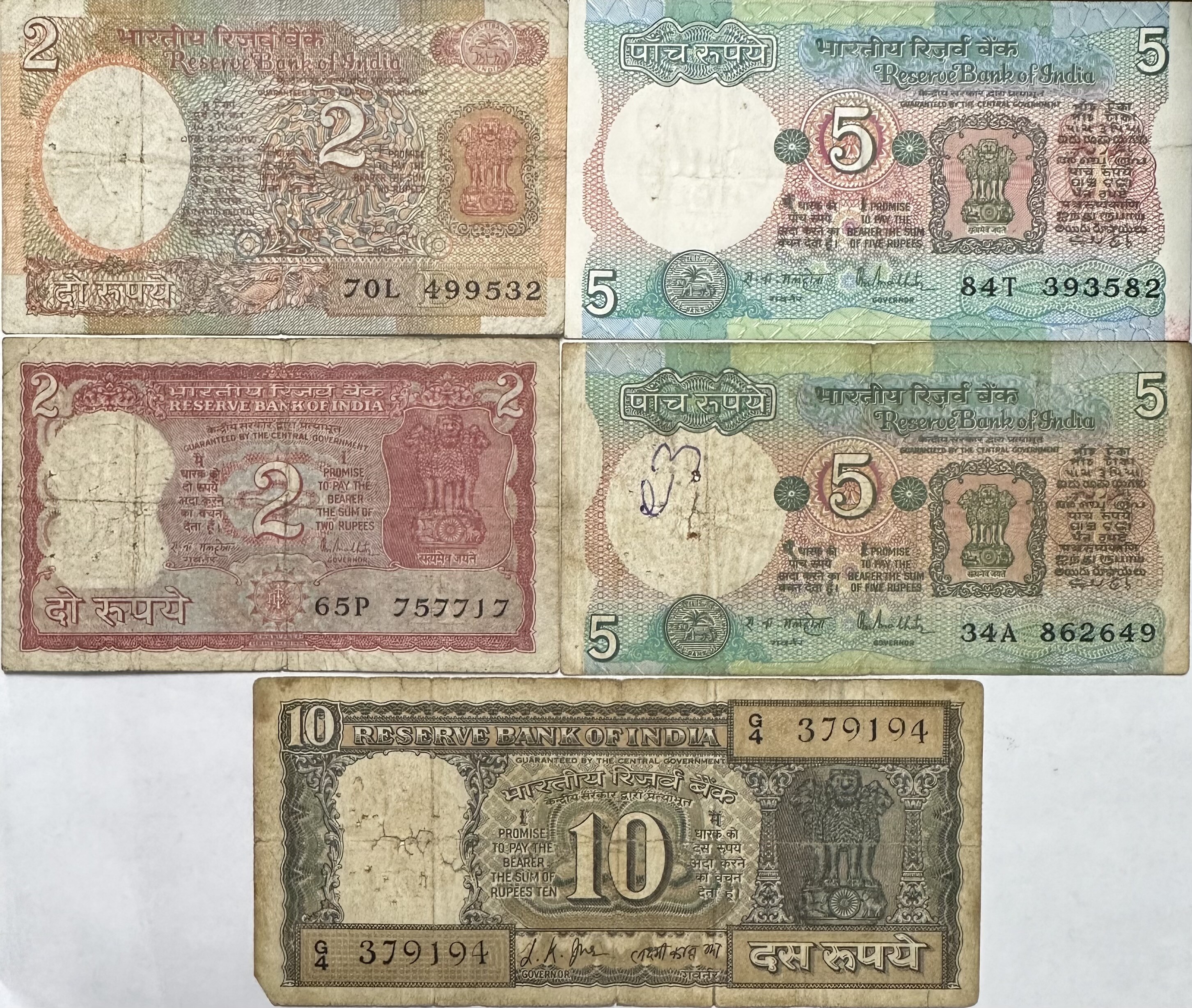 India Paper Currency - (2) 2 and 5 Rupee and (1) 10 Rupee Banknotes - 5 Notes