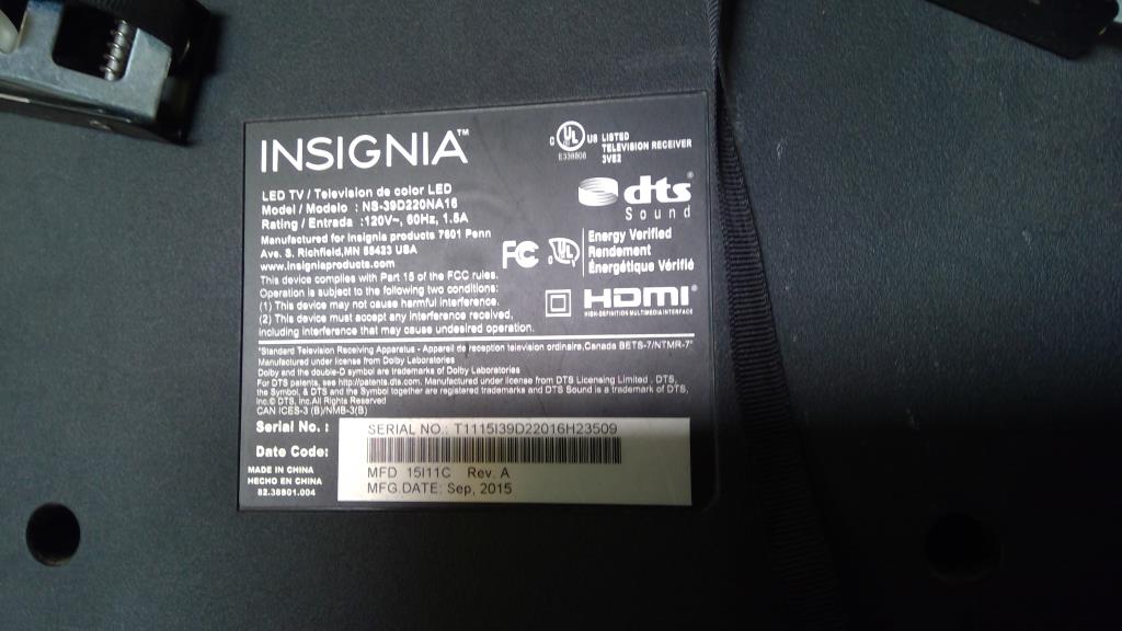 Get a great deal with this online auction presented by PropertyRoom.com on behalf of a law enforcement or public agency client. Model: NS-39D220NA16 Screen Size: 38" Date of Manufacture: September 2015 Measurements: 34"x20" Base: none Remote Control: none Power Cord: included Physical Condition: good, has power, slightly dusty Testing Results: Item was tested for power only and it powered on, displayed menu. Input and output ports were not tested and may be non-functional. Item is sold "As Is".