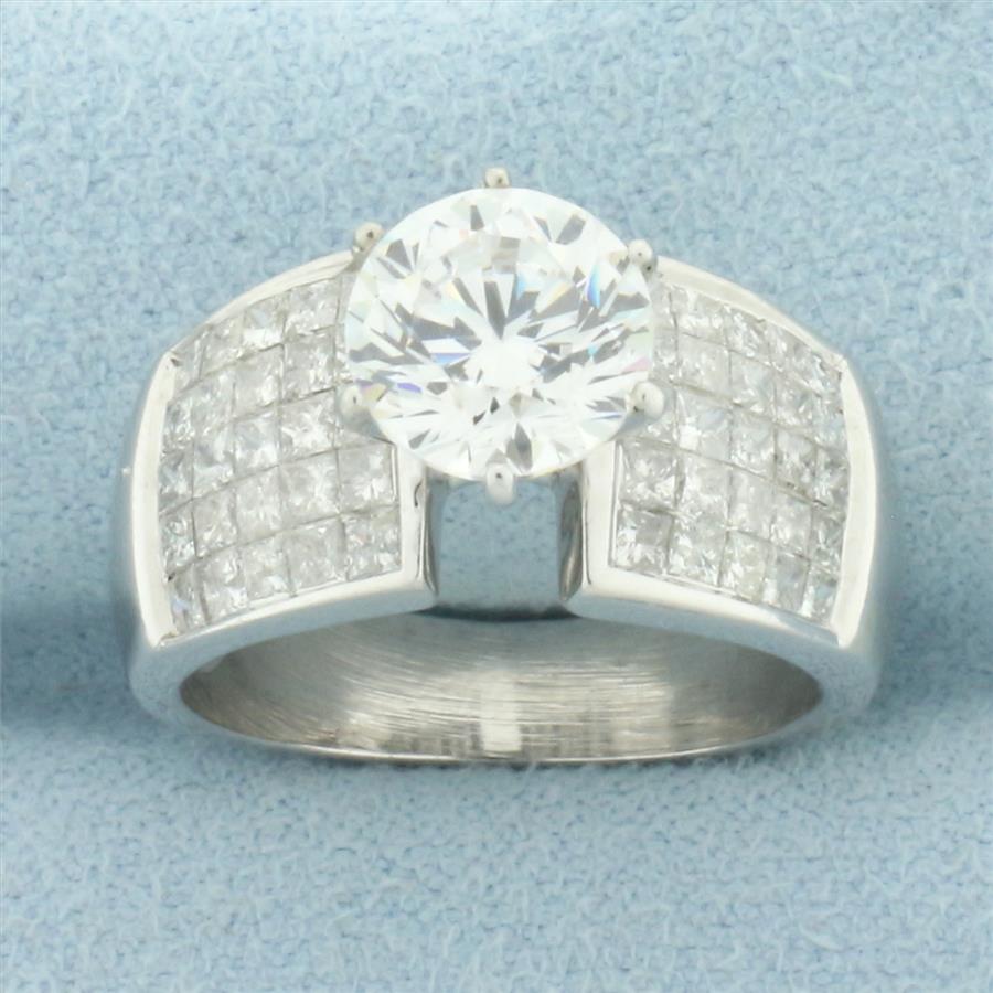 In 14k white gold. Contains one high quality 2ct CZ gemstone with excellent cut and clarity for added brilliance. Also contains fifty high quality princess cut diamonds, 2ct TW, H color/I clarity. Size: 7.25. 8.3g.