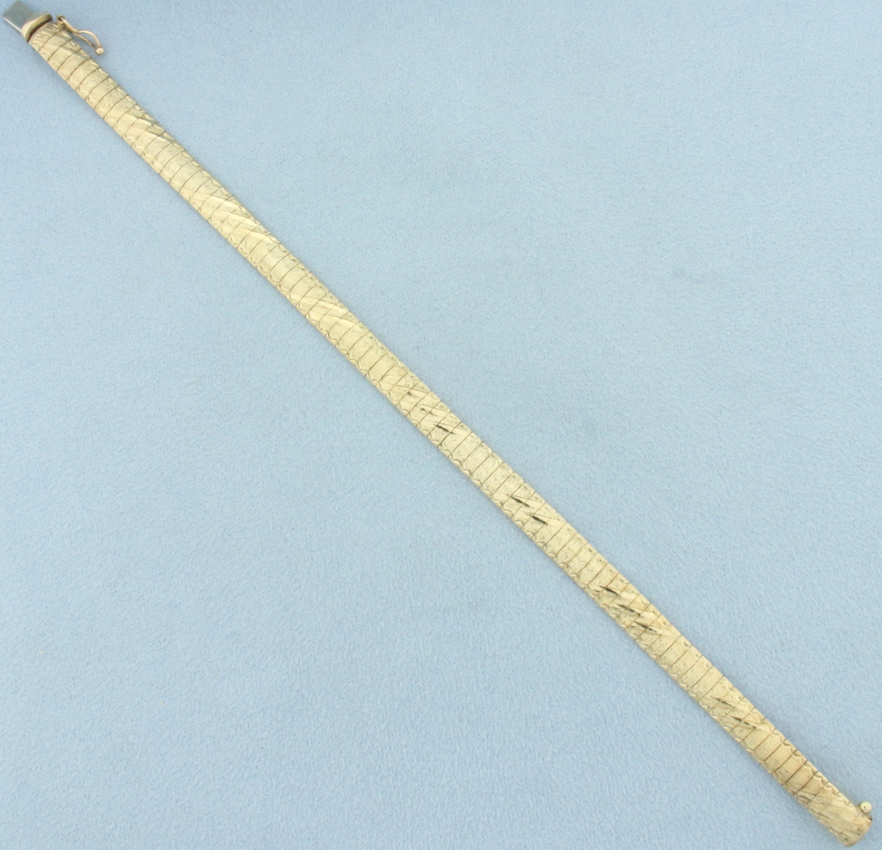 In 10k Italian made yellow gold. 7 1/8 inches long, 1/4 inch wide. Concealed slide clasp with safety latch. 12.0g