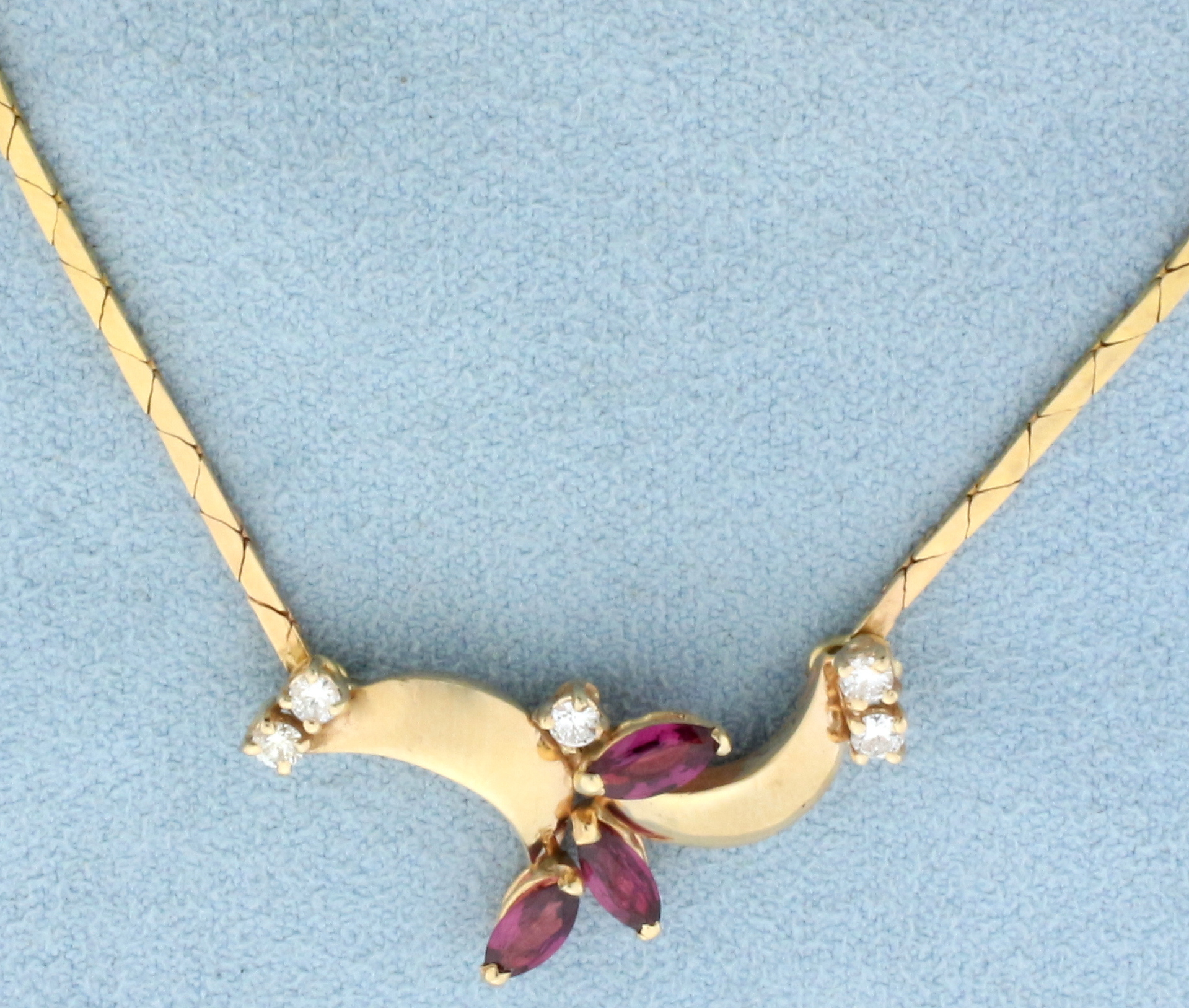 In 14K Yellow Gold. Contains three high quality natural 6 x 3mm marquise cut Ruby gemstones with intense ruby red color and excellent clarity. Also contains four high quality .05ct Diamonds, VS clarity/H color. 16 inch long Cobra link Chain Necklace, 1.24mm wide. 9.1g.