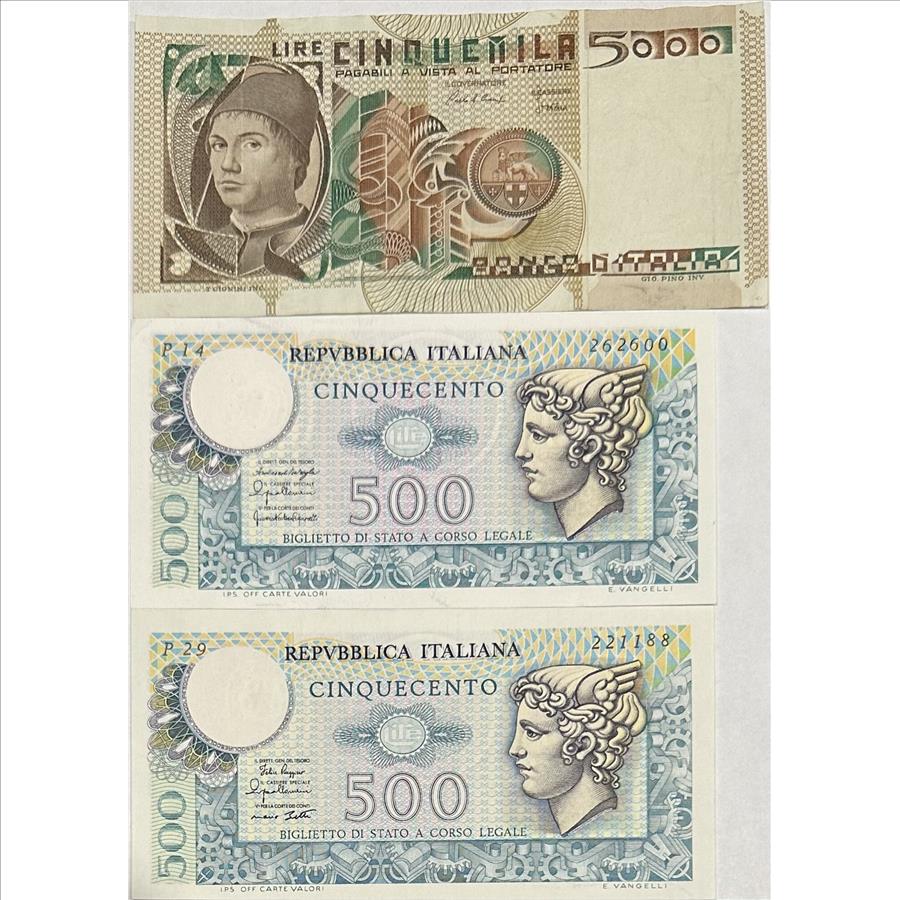 >Italy Very Crisp 5000 Lire and (2) 500 Lire Notes - 3 Notes