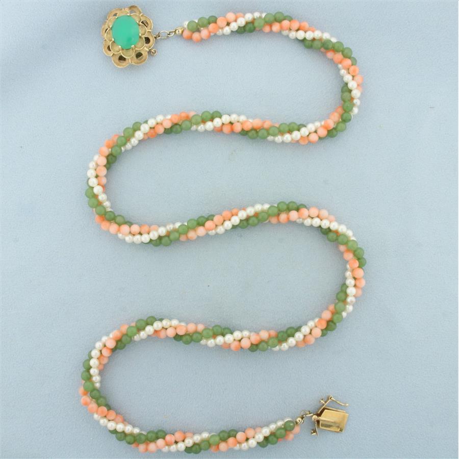 Jade, Pink Skin Coral, and Pearl Necklace in 14k Yellow Gold