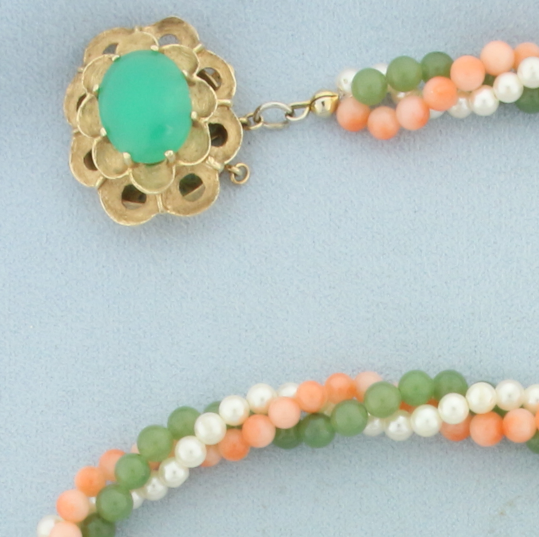 In 14k yellow gold clasp. Contains three twisting strands of 4mm jade beads, pink skin coral beads, and cultured pearls with high luster. 22.5 inches long, 8mm wide (3 strands together). Decorative slide clasp with safety latch holds 14mm by 11mm jade gemstone with vibrant green color. 50.9g.
