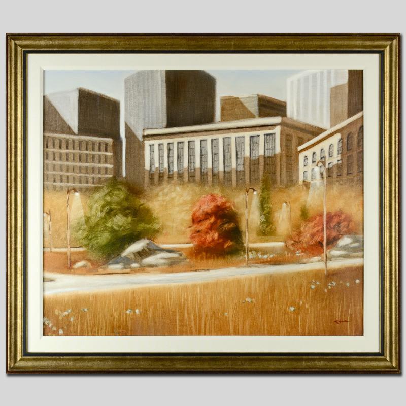 With rich colors and clean, elegant lines, Jeff Surret's art is always a collector's item. "City View" is an original painting on canvas, hand signed by Surret! This piece has been custom framed using acid free and archival materials, and is ready to hang. Measures approx. 46" x 40" (with frame), 37.5" x 31" (image).
