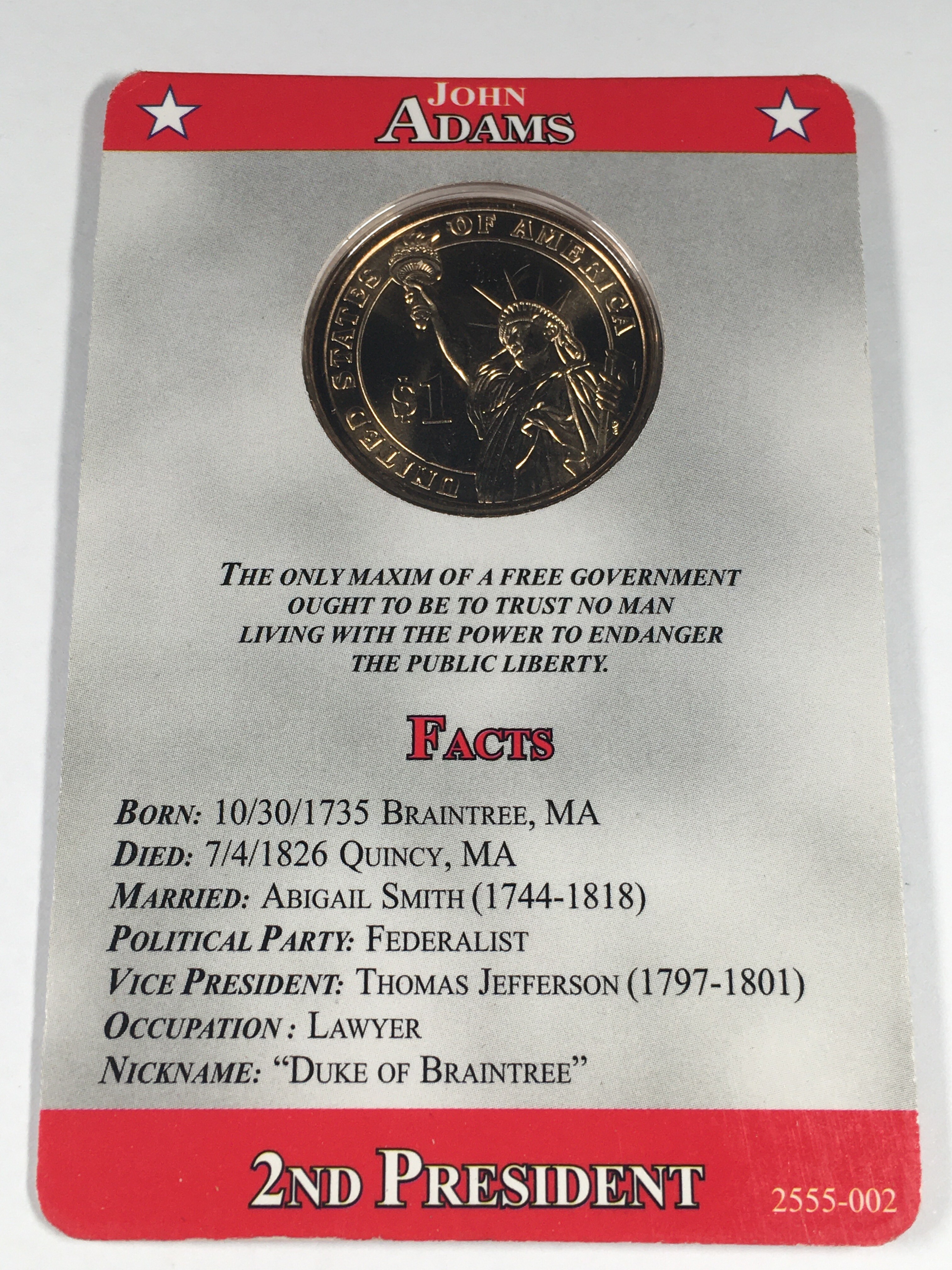 John Adams Presidential Commemorative Dollar*Brilliant Uncirculated*Facts Card