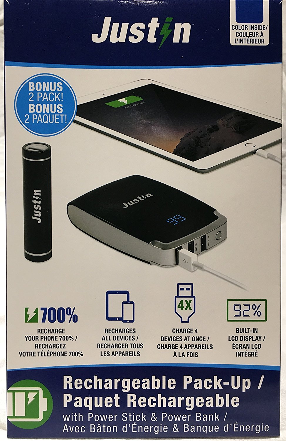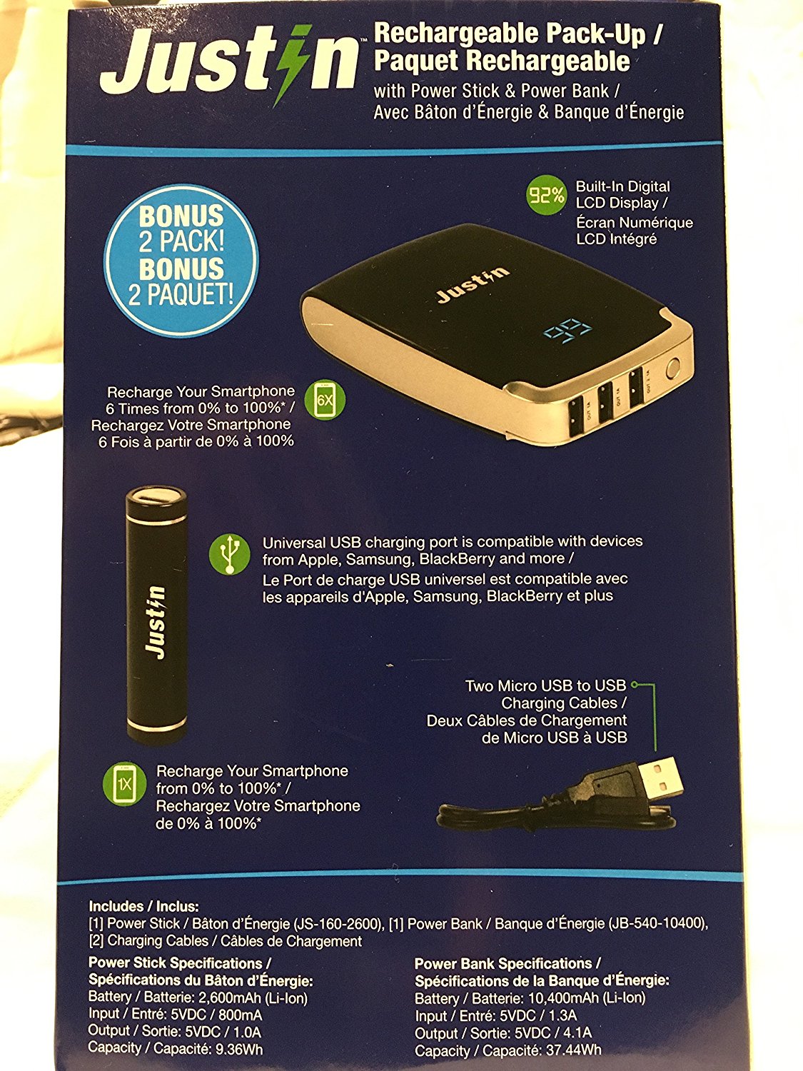 Justin Rechargeable 2 Pack Powerbank (Bank10,400mAh) (Stick 2,600mAh)