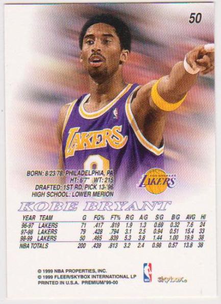 This is a Kobe Bryant 1999-00 Skybox Premium #50 card.  This is an approximately EX-MT condition card of this NBA Hall Of Famer.  It has light edge wear, but overall displays pretty well.