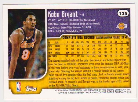 This is a Kobe Bryant 1999-00 Topps #125 card.  It is an approximately EX condition card of this NBA Hall of Famer. It has light corner/edge wear but overall displays pretty well.