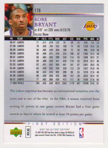This is a 2007-08 Upper Deck First Edition Kobe Bryant #178 card.  This is an approximately EX-MT condition card of this legendary basketball player.