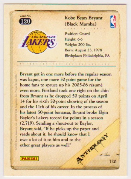 This is a 2012 Panini Anthology Kobe Bryant #120 card.  This is a nice approximately NM-MT condition card of this NBA Hall of Famer.