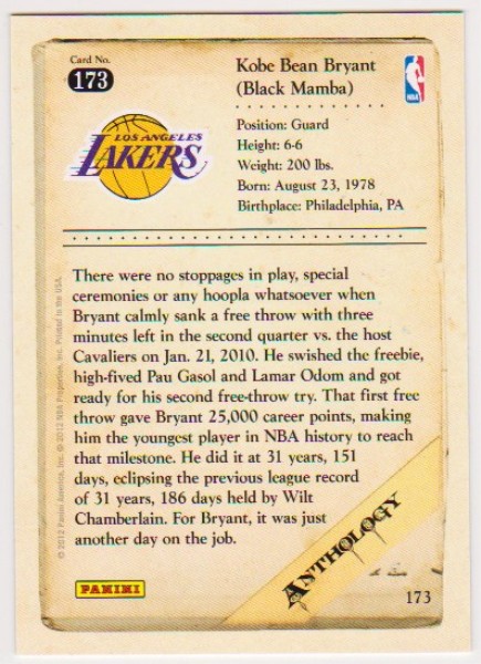 This is a 2012 Panini Anthology Kobe Bryant #173 card.  This is a nice approximately NM-MT condition card of this NBA Hall of Famer.