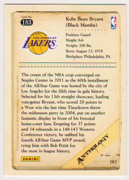 This is a 2012 Panini Anthology Kobe Bryant #183 card.  This is an approximately Near Mint condition card of this NBA Hall of Famer.