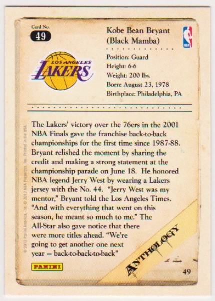 This is a 2012 Panini Anthology Kobe Bryant #49 card.  This is a nice approximately NM-MT condition card of this NBA Hall of Famer.