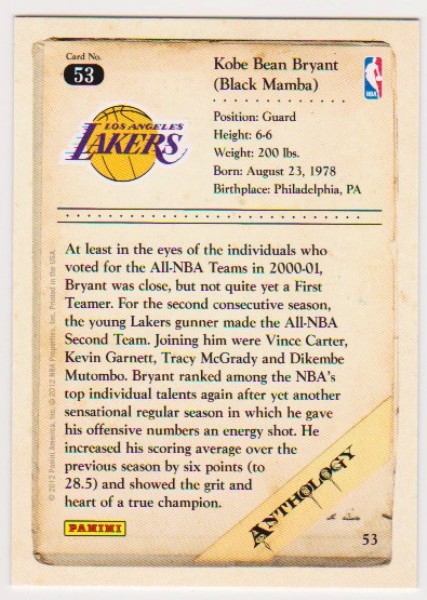 This is a 2012 Panini Anthology Kobe Bryant #53 card.  This is a nice approximately NM-MT condition card of this NBA Hall of Famer.