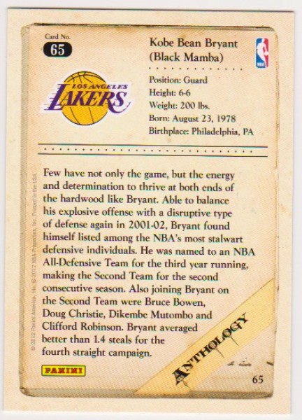 This is a 2012 Panini Anthology Kobe Bryant #65 card.  This is a nice approximately NM-MT condition card of this NBA Hall of Famer.