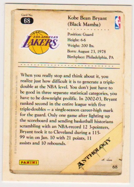 This is a 2012 Panini Anthology Kobe Bryant #68 card.  This is a nice approximately NM-MT condition card of this NBA Hall of Famer.