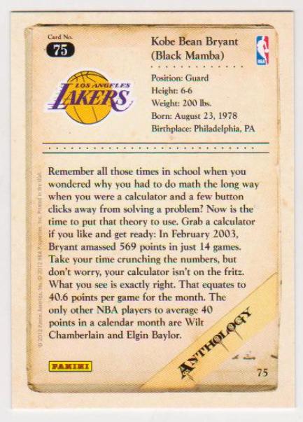 This is a 2012 Panini Anthology Kobe Bryant #75 card.  This is a nice approximately NM-MT condition card of this NBA Hall of Famer.