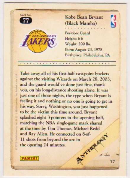 This is a 2012 Panini Anthology Kobe Bryant #77 card.  This is a nice approximately NM-MT condition card of this NBA Hall of Famer.