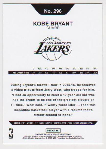 Kobe Bryant 2018-19 Hoops #296 Card