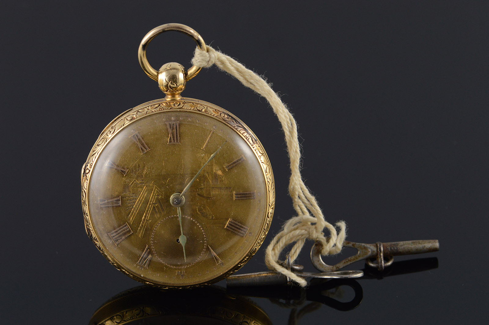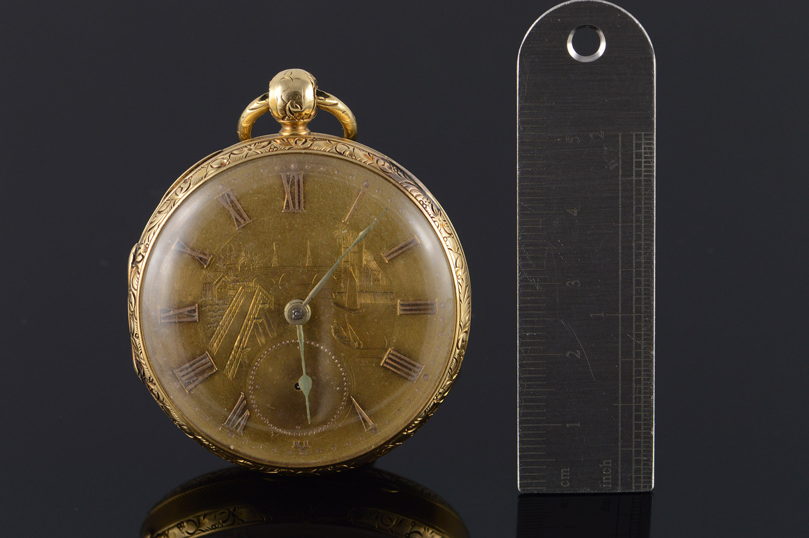 Item:  L H Samuel & Co of Liverpool 48mm Case Key Wind Bridge Scene Dial Pocket Watch