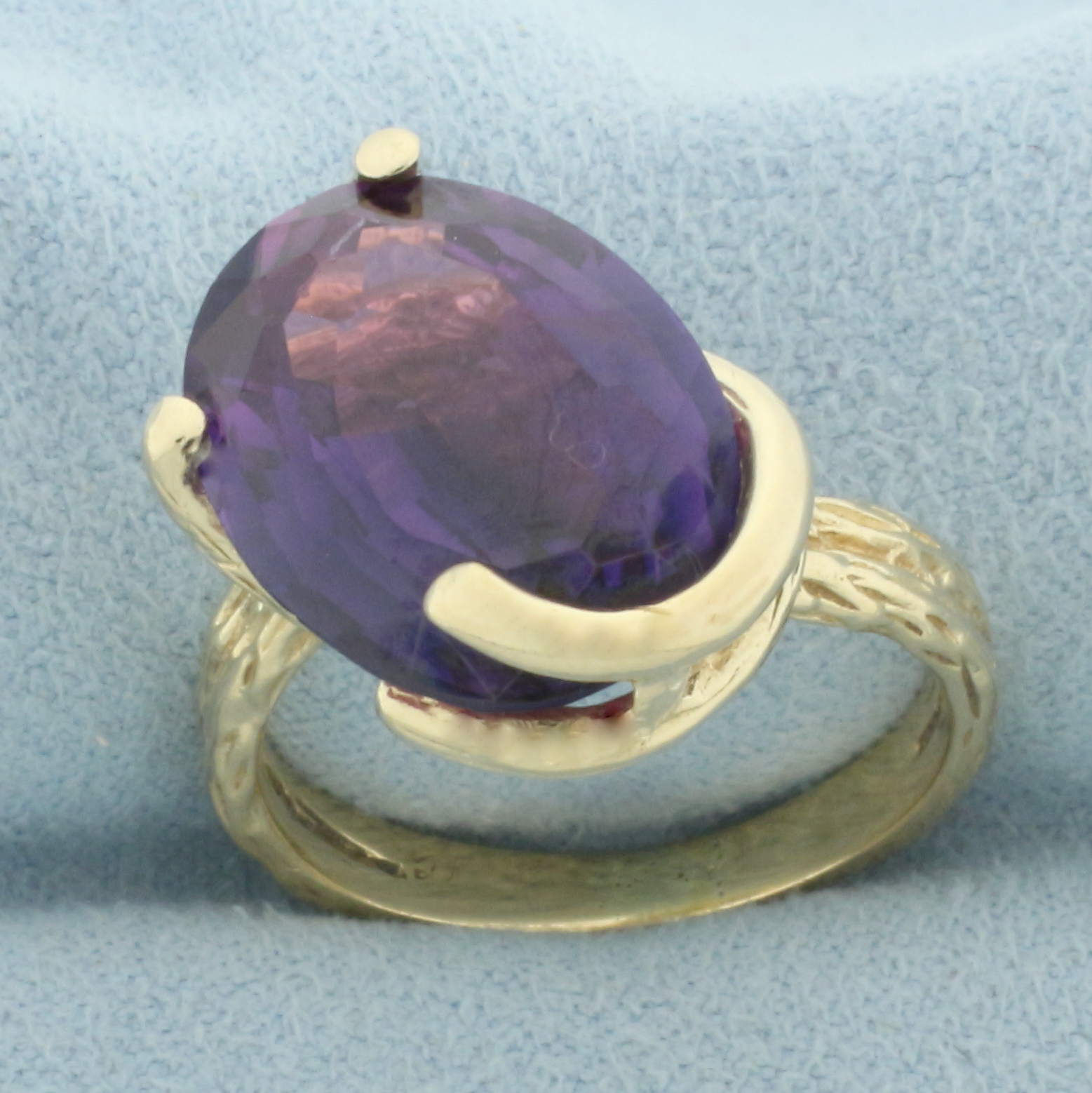 In 14k yellow gold. Contains one high quality 16mm x 12mm 10ct lab Sapphire gemstone with intense purple blue color and excellent clarity. Size: 7.5. 7.2g.