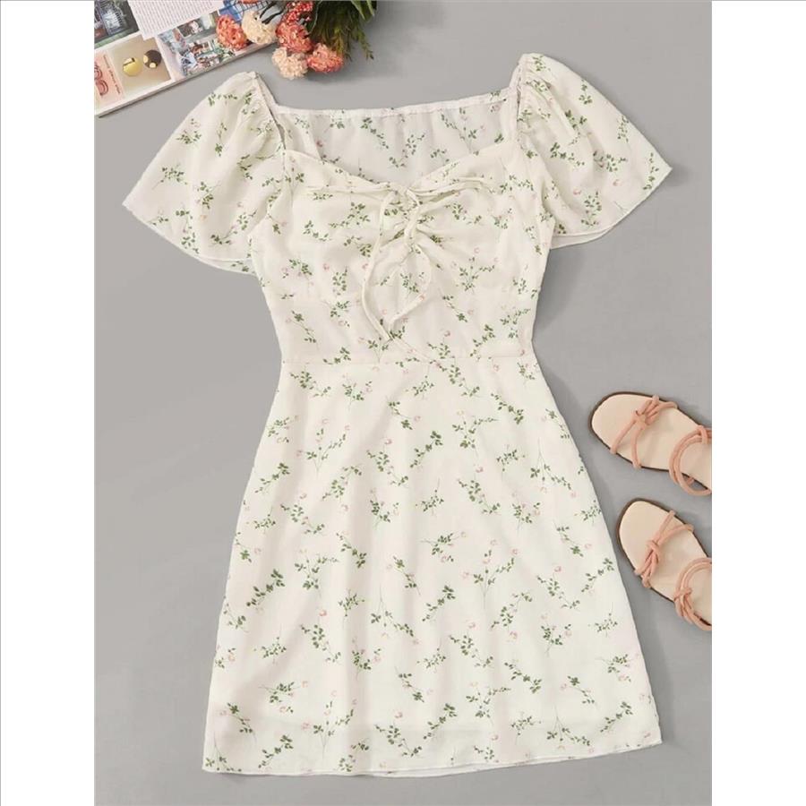 LADIES DITSY FLORAL DRAWSTRING TIE FRONT DRESS - XS