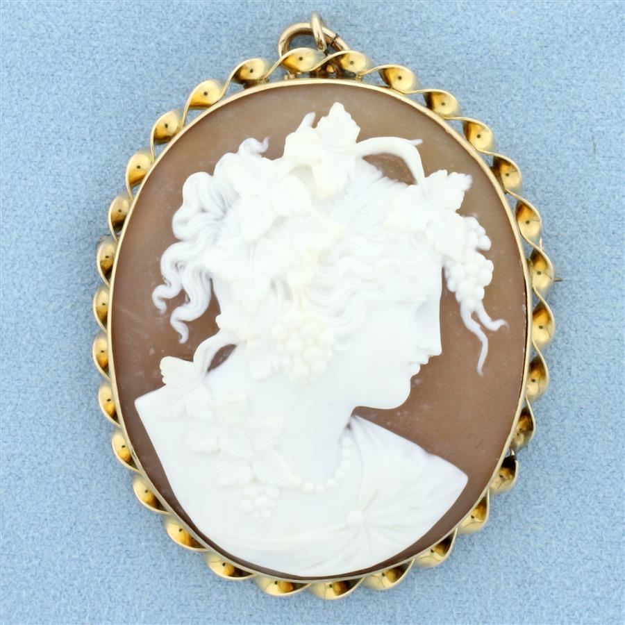 Large Vintage Shell Cameo Pin or Pendant in 10k Yellow Gold