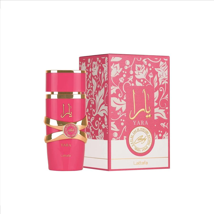 Yara Candy by Lattafa Perfumes is a Floral Fruity Gourmand fragrance for women. Top notes are Black Currant and Green Tangerine; middle notes are Strawberry Fizz Candy and Gardenia; base notes are Vanilla, Musk, Amber and Sandalwood.