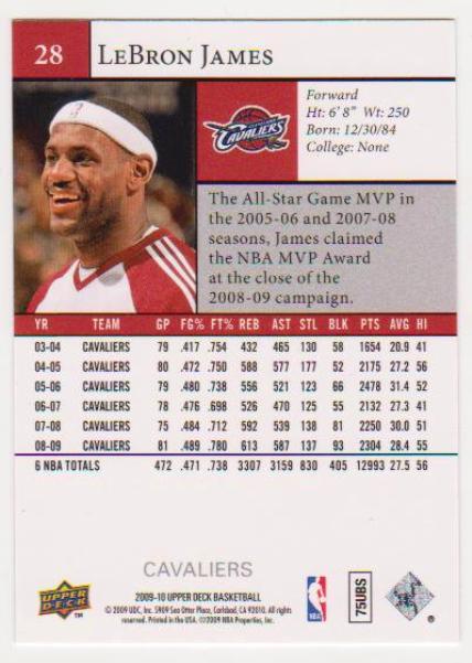 This is a 2009-10 Upper Deck Lebron James #28 card.  It is an approximately EX-MT condition card of this NBA star.  There is a little corner wear but overall is a nice card of this NBA star.