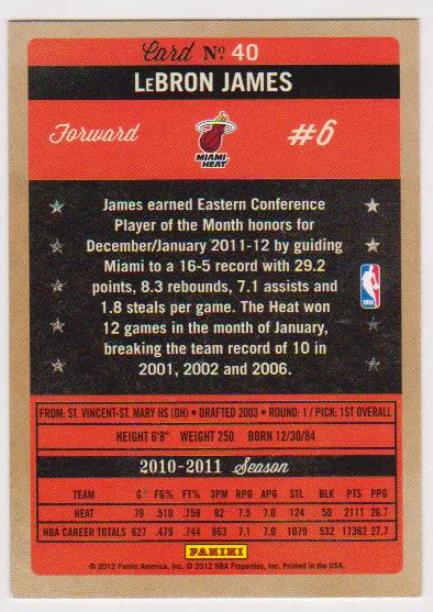 This is a 2011-12 Panini Past & Present Lebron James #40 card.  It is a nice approximately Near Mint condition card of this NBA star.