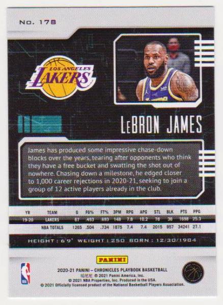 This is a Lebron James 2020-21 Panini Chronicles Playbook #178 card.  It is in approximately Near Mint condition.  This is a nice card of this NBA star.
