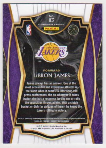 This is a 2020-21 Panini Select Lebron James #113 card.  It is in approximately NM-MT condition.  This is a nice looking card of this NBA star.