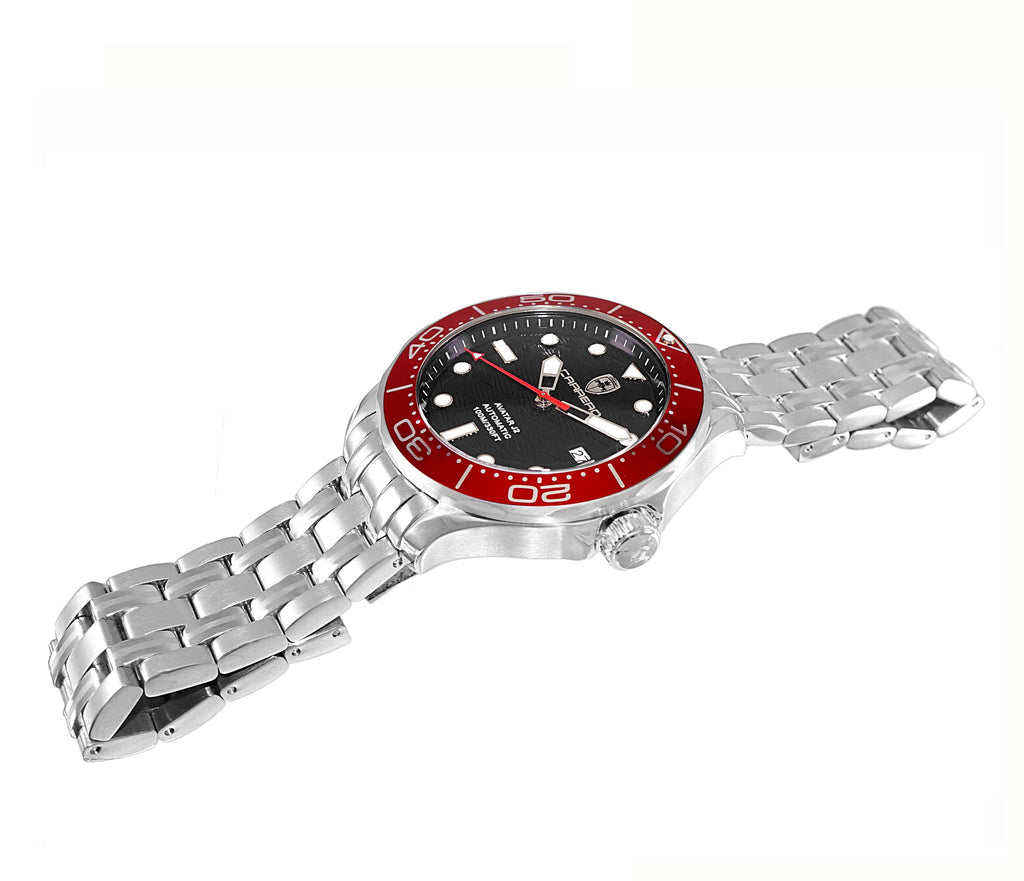 Lechateau Watches - Automatic -24 Jewels NH35, Textured Black Date dial, Red bezel, Retail at (MSRP: 2,268.00)