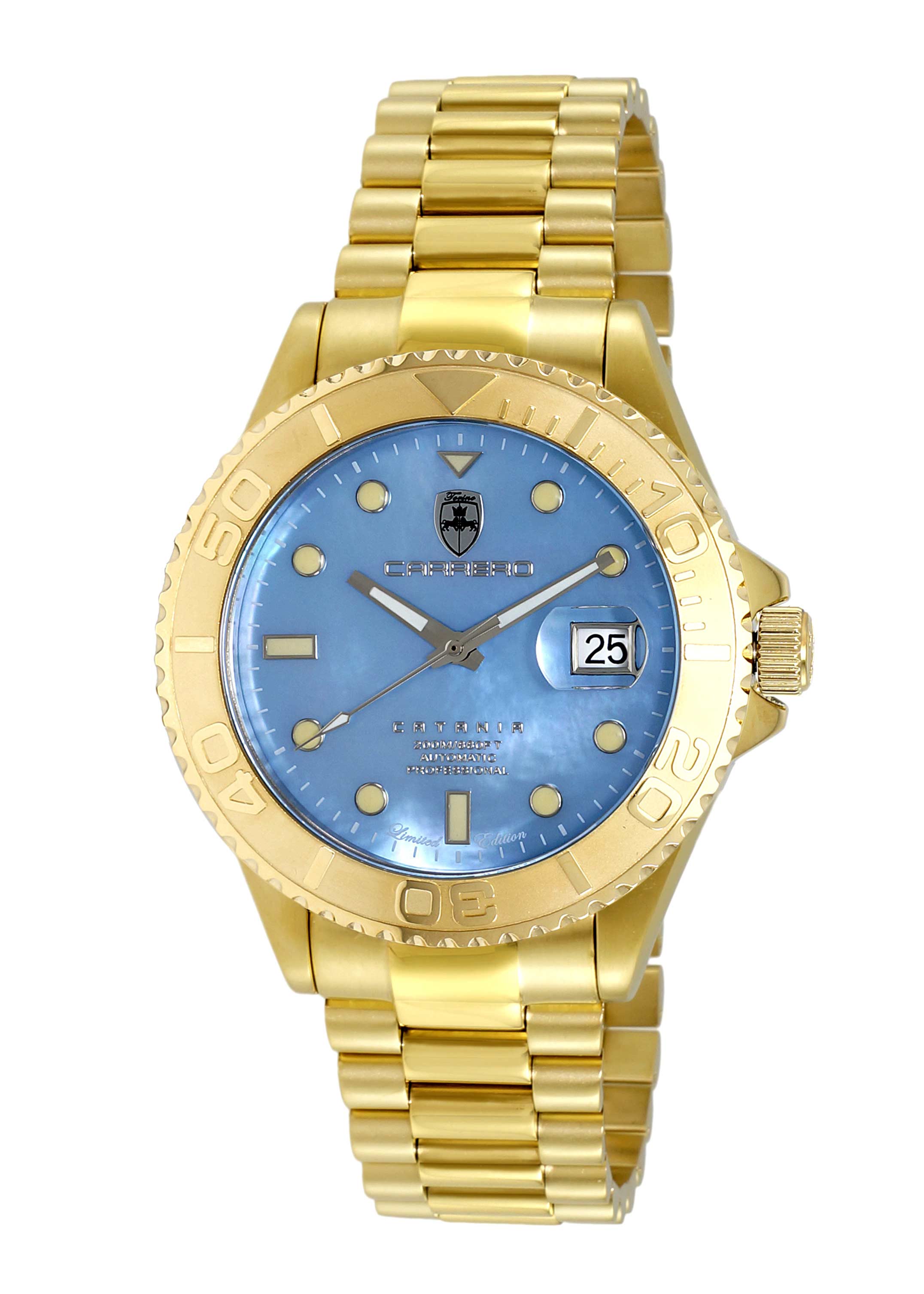 Lechateau Watches Men's Automatic - Magnifying Date, Blue MOP Dial with Goldtone Case and Band - C1G266GO-BU - Retail at (MSRP: $ 2,124.00)