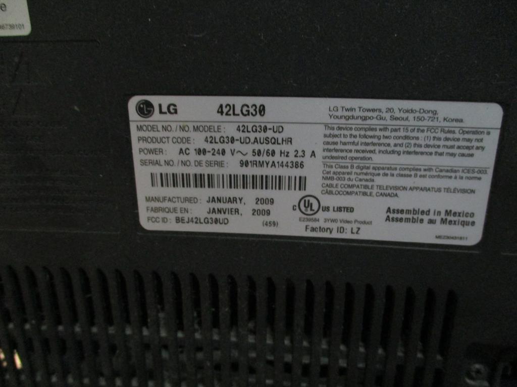 Get a great deal with this online auction presented by PropertyRoom.com on behalf of a law enforcement or public agency client. Model: 42LG30 Screen Size: 42" Date of Manufacture: 2009 Measurements:29" T, 42" W, 10" L Base: YES Remote Control: NO Power Cord: NO Physical Condition: FAIR CONDITION, A LITTLE WOBBLY AND POWERS ON Testing Results: Item was tested for power only and it powered on, displayed menu. Input and output ports were not tested and may be non-functional. Item is sold "As Is".
