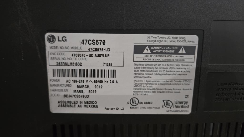 Get a great deal with this online auction presented by PropertyRoom.com on behalf of a law enforcement or public agency client. Model: 47CS570-UD Screen Size: 47" Date of Manufacture: unk Measurements: height 27.4, width 3.0, length 44.6 Base: no Remote Control: no Power Cord: no Physical Condition: fair and dirty Testing Results: Item was tested for power only and it powered on, displayed menu. Input and output ports were not tested and may be non-functional. Item is sold "As Is".