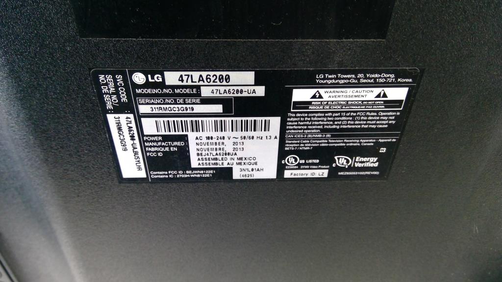 Get a great deal with this online auction presented by PropertyRoom.com on behalf of a law enforcement or public agency client. Model: 47LA6200-UA Screen Size: 47" Date of Manufacture: November 2013 Measurements: Approximately 24.5"H x 42.5"L x 3" Base: No Remote Control: No Power Cord: Yes Physical Condition: Used, Fair; Dirty/dusty with scuffs, marks, and scratches; Screen is scratched Testing Results: Item was tested for power only and it powered on, displayed menu. Input and output ports were not tested and may be non-functional. Item is sold "As Is".