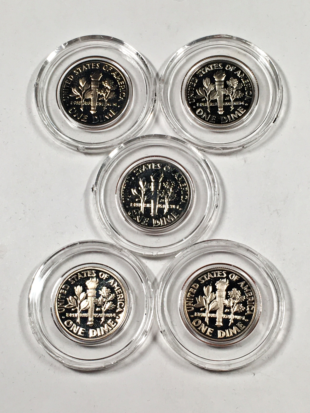 Lot of Five (5) Proof Roosevelt Dimes in Capsules and Gift Box: Various Dates From 1968-S thru 2005-S